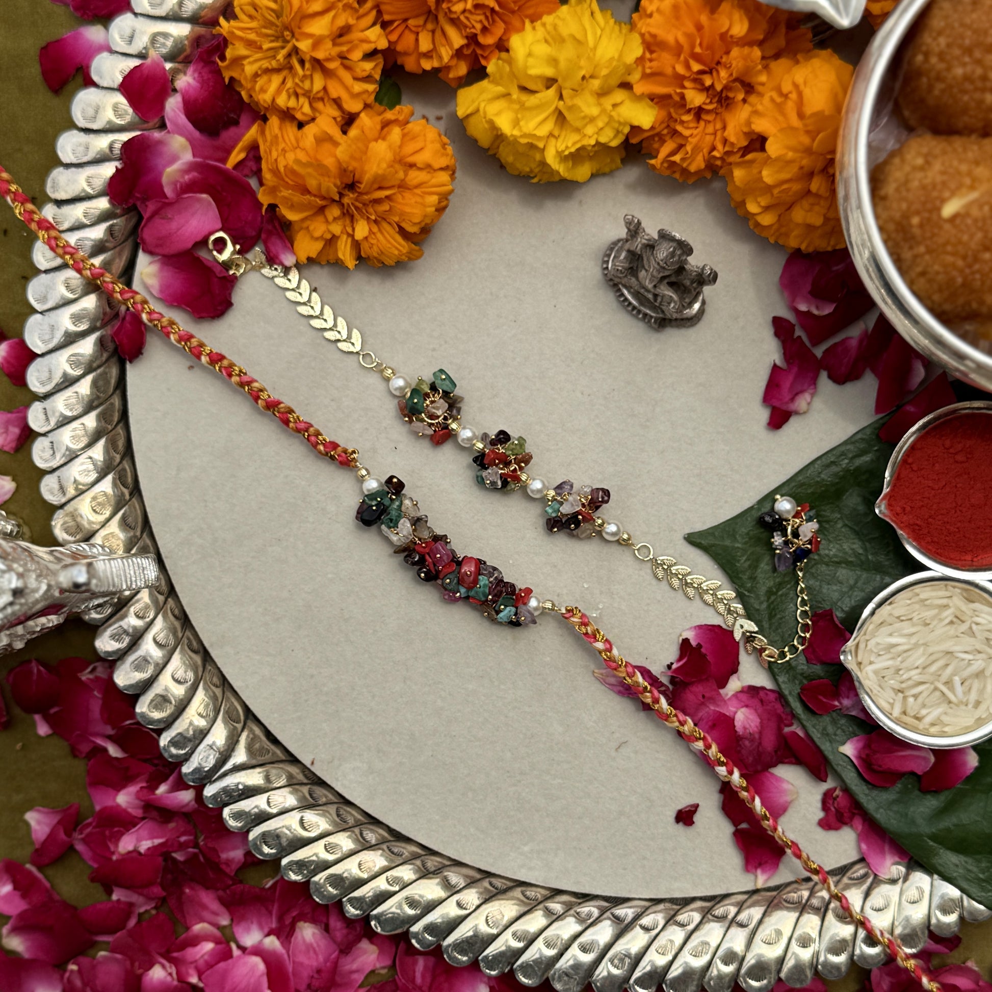 Natural Gemstone Multi Uncut Gemstones & Signity Pearl Rakhi Pair